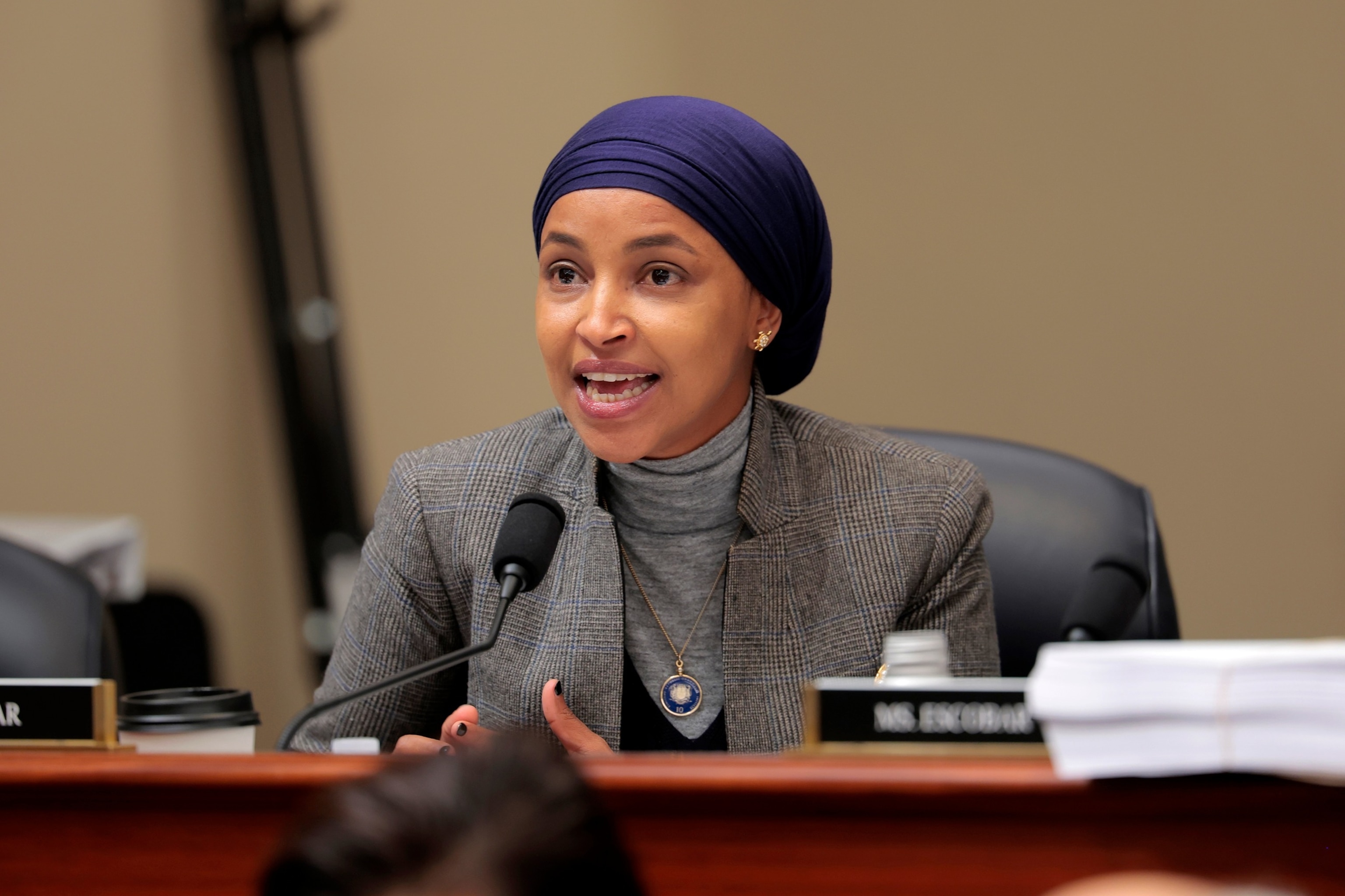 Representative Ilhan Omar speaks during a sideline meeting with the House Budget Committee on Capitol Hill on May 16, 2025 in Washington, DC.